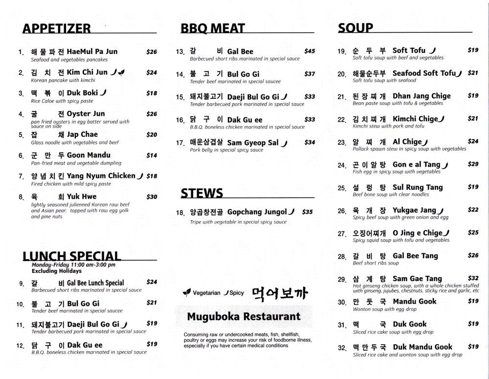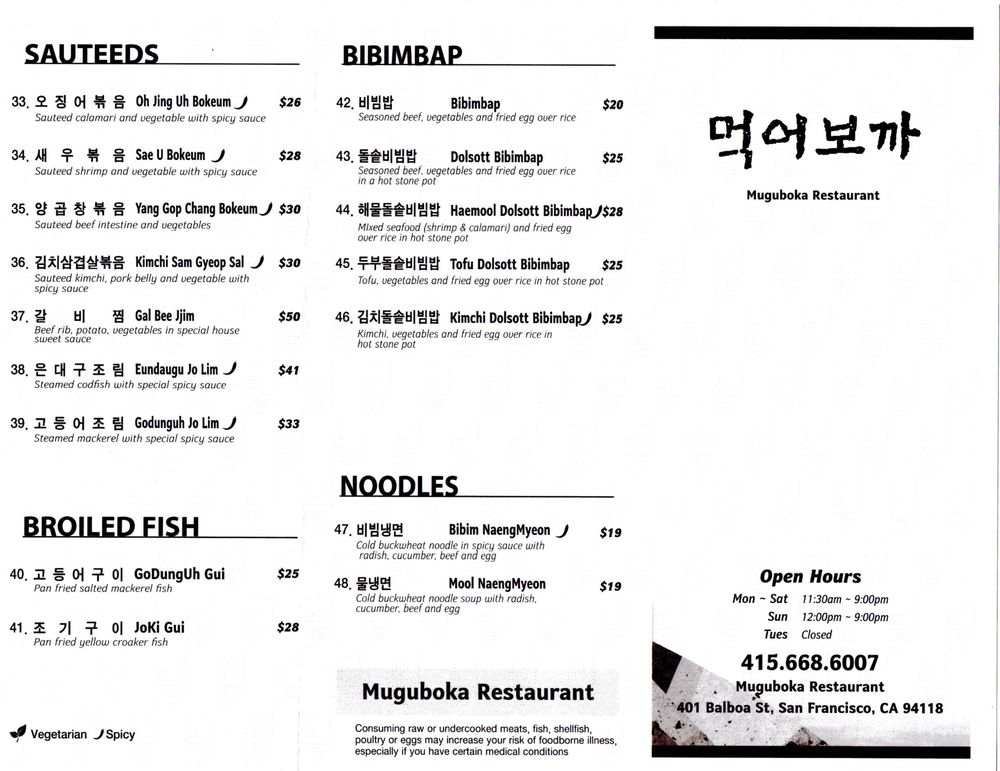 Muguboka Restaurant located in San Francisco, CA offers a delectable menu featuring Korean dishes like yukgaejang, bibimbap, spicy squid stir fry, beef tartare, and more. Customers praise the delicious and fresh flavors of the food, especially highlighting dishes like sam gyeop sal, tofu soup, jab jap chae with beef, and al chige. Complimentary dishes like mandu, kimchee pancake, seafood pancake, and tofu soup add to the overall dining experience. The restaurant's cozy ambiance and friendly staff create a welcoming environment for customers. With options for delivery, takeout, and catering, Muguboka is a convenient choice for Korean comfort food lovers looking for an authentic and satisfying meal.